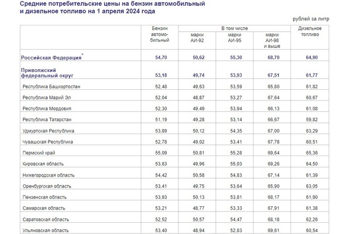 В число двух дюжин регионов, где цены выросли, вошла и Саратовская область. За последнюю неделю марта цены на литр АИ-92 выросли на 26 копеек, на АИ-95 — на 22 копейки, на АИ-98 на 40 копеек, а на дизельное топливо — на 19 копеек. Теперь 92-й бензин стоит в среднем 50,57 рубля за литр, 95-й — 54,47 рубля, 98-й — 68,18 рубля, ДТ — 62,26 рубля.