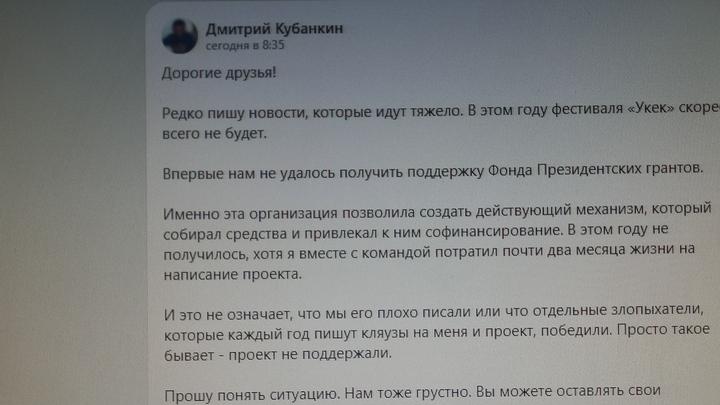 Фото страницы Дмитрия Кубанкина "ВКонтакте" В текущем году фестиваля «Укек», скорее всего, не будет.