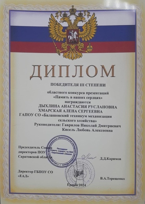 Исследовательская работа, посвящённая нашему земляку Герою Советского Союза Белозерцеву Н.А., выполненная студентками Балашовского техникума механизации сельского хозяйства Дыхиной А.Р. и Хмарской А.С.
