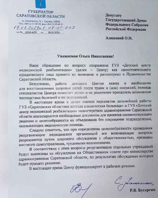 В ответ на мой депутатский запрос о сохранении деятельности Саратовского Детского центра медицинской реабилитации пришел ответ от Губернатора региона Романа Бусаргина.