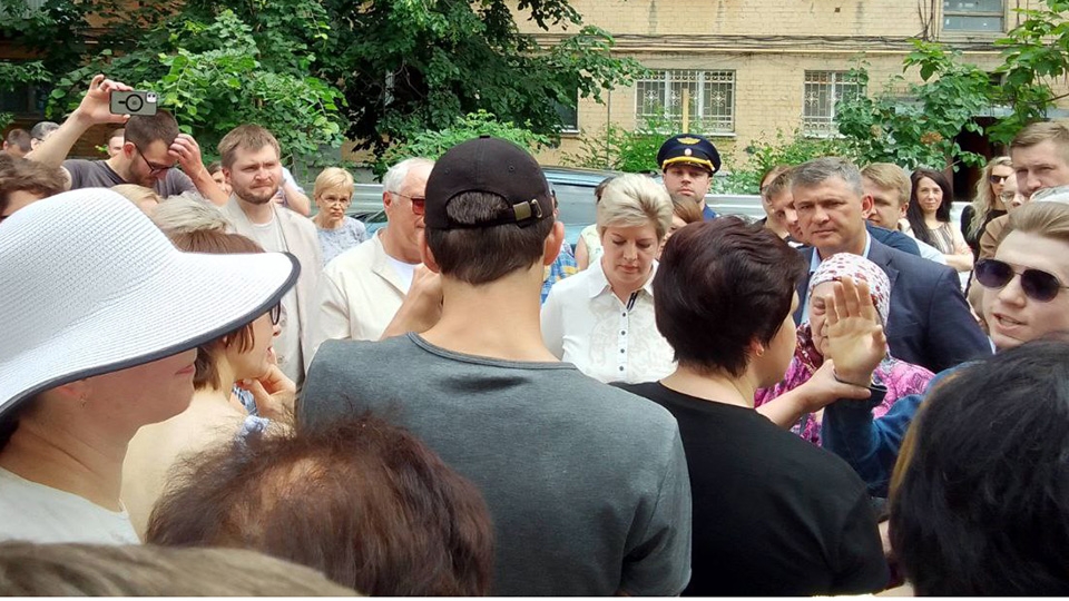 На встречу пришли глава города Лада Мокроусова , глава района Игорь Струков , спикер гордумы Сергей Овсянников и около сотни жильцов.