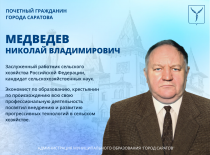 Сегодня, 6 апреля, День рождения отмечает Почетный гражданин города Саратова, Заслуженный работник сельского хозяйства Российской Федерации, кандидат сельскохозяйственных наук Николай Владимирович Медведев.