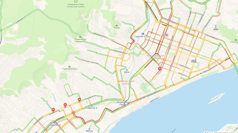 Традиционно затруднено движение на центральных улицах города, включая Астраханскую, Рабочую, Московскую, улицу Чернышевского, Соколовой, Большой Горной, Мичурина, Университетскую, Аткарскую и Большую Казачью.