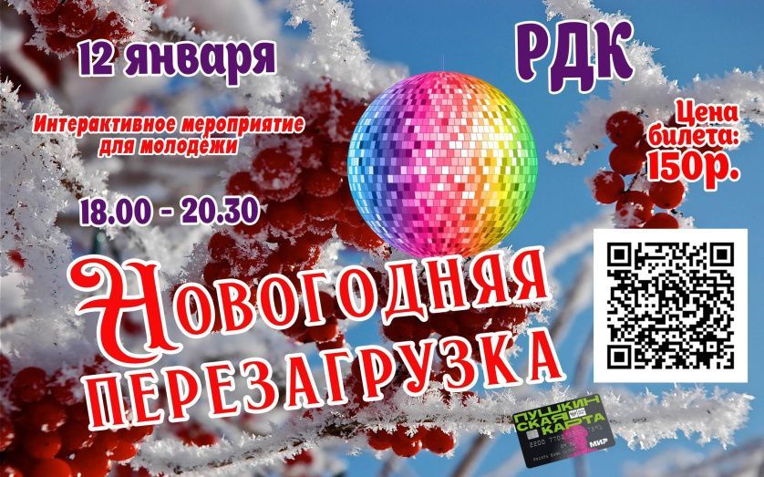 12 января в 18:00 танцпол районного Дома культуры приглашает самую яркую и зажигательную молодежь на новогоднее интерактивное мероприятие «Новогодняя перезагрузка».