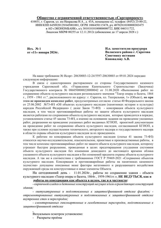 В распоряжение редакции он предоставил ответ, который ООО "Саргорпроект" подготовило для прокуратуры Волжского района.