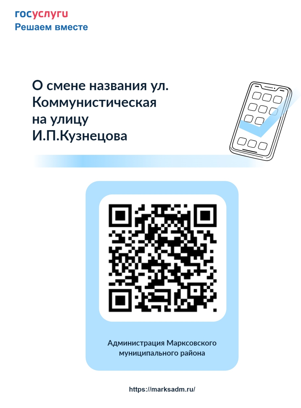 Приглашаем вас принять активное участие в опросе по переименованию одной из улиц города в честь Героя Социалистического труда Ивана Петровича Кузнецова, который внёс огромный вклад в развитие района. Решение о проведении публичного обсуждения было принято на заседании Общественного совета Марксовского района. В улицу им. И.П. Кузнецова предлагается переименовать ул. Коммунистическую, где располагается здание нынешнего колледжа искусств, а в советские годы размещался Марксовский горком, которым руководил Иван Петрович Кузнецов.
