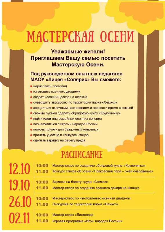 Под руководством педагогов Лицея «Солярис» вы научитесь создавать осенние украшения, познакомитесь с играми народов России, совершите экскурсию по осеннему парку, найдете идеи для семейных вечеров и отлично проведете время с близкими в живописном месте.