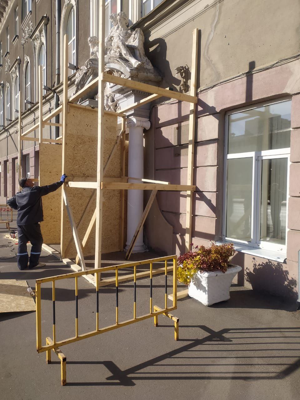 Специалисты подрядной организации приступают к реставрации скульптурной группы над входом в здание администрации города.