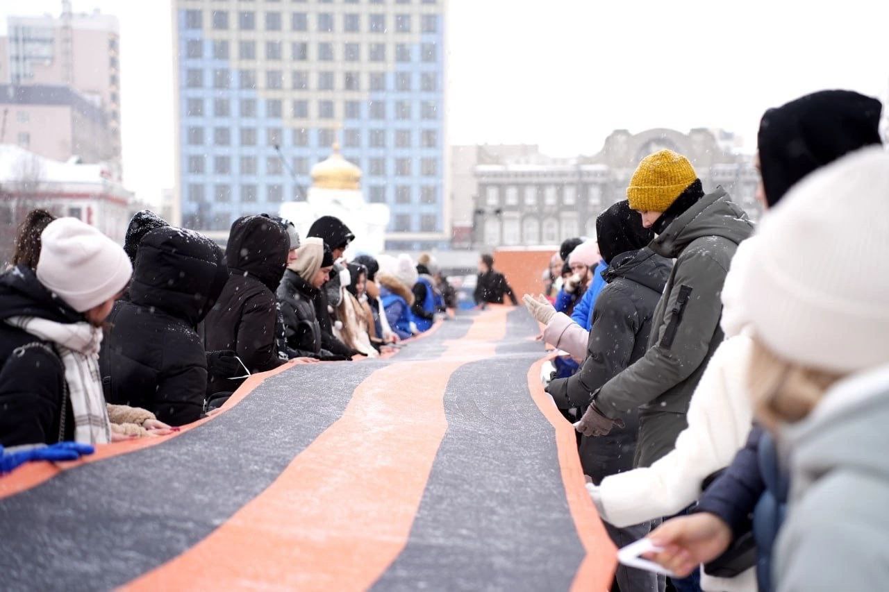 В честь 80-летия снятия блокады Ленинграда на главной площади региона развернули 100 метровую Георгиевскую ленту