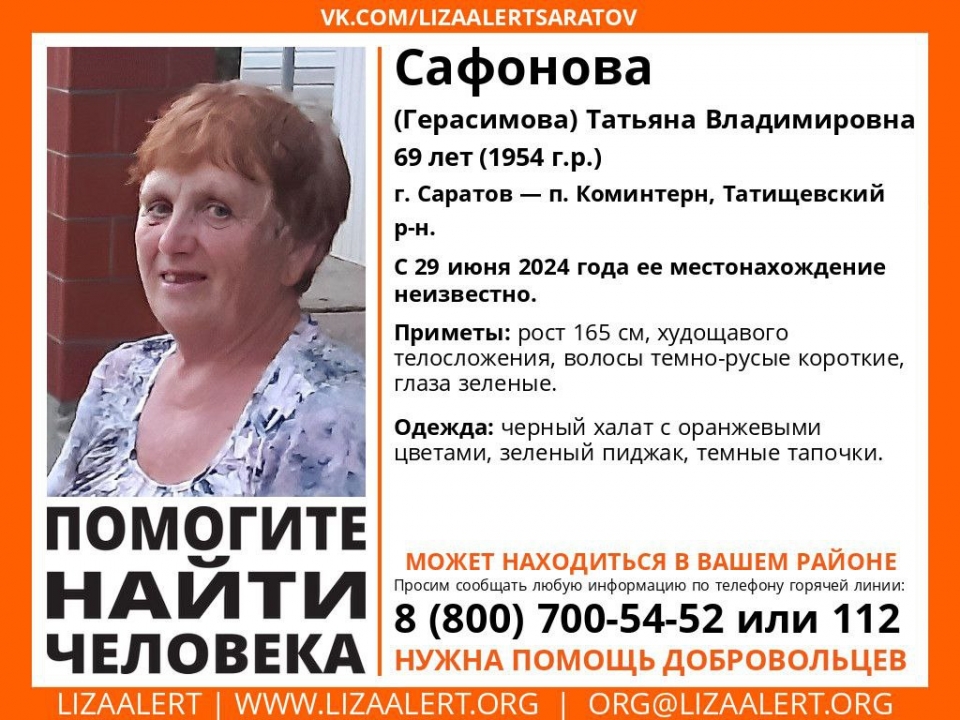 В Саратовской области пропала 69-летняя Татьяна Сафонова ( Герасимова ). Об этом сообщает поисковый отряд "Лиза Алерт Саратов".