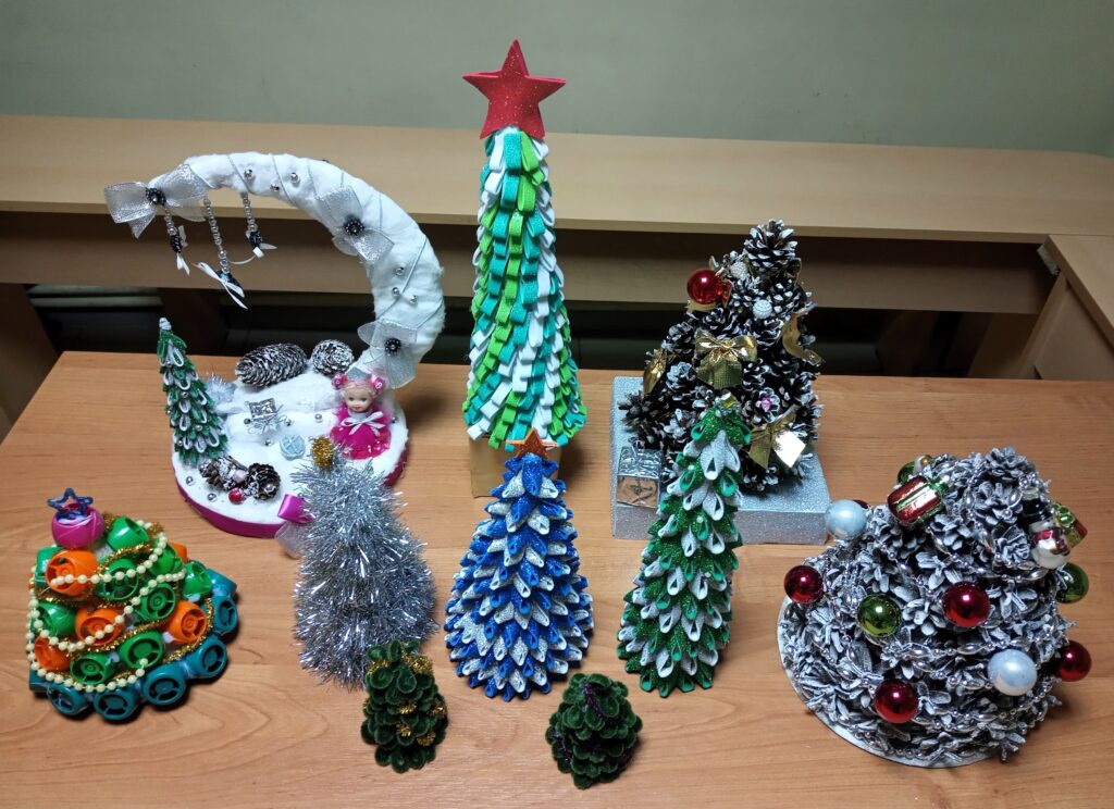 Дети представили оригинальные работы, сделанные из различного материала: ткани, шишек, крышек, мишуры.